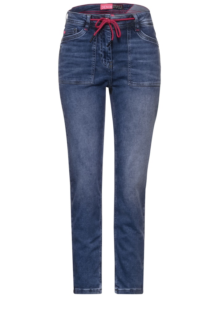 Leger Style! Loose Fit Damenhose im Style Tracey von CECIL. In Middle Waist mit Slim Legs und Stretchanteil sitzt sie sehr bequem. Tiefe Eingriffstaschen und der legere Fit im Jogg Style geben ihr eine sportliche Note. Hingucker sind das Tunnelzugband und der Anhänger am Bund in Kickfarbe, die einen tollen Akzent setzen.