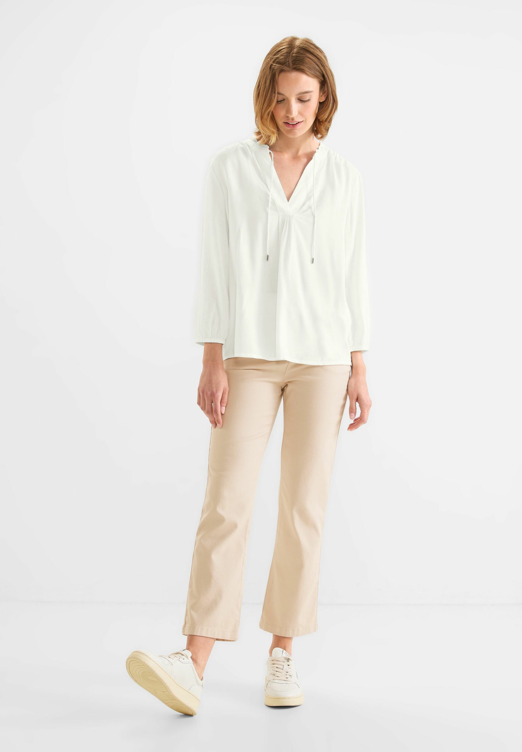 Auf nach Ibiza! Lässige Damenbluse von Street One, die im Tunikastyle begeistert. Ein legerer Look mit Tunikabändchen und 3/4 Ärmel mit Gummizug. Der geschlitzte Rundhalsausschnitt rundet den unifarbenen Style cool ab.